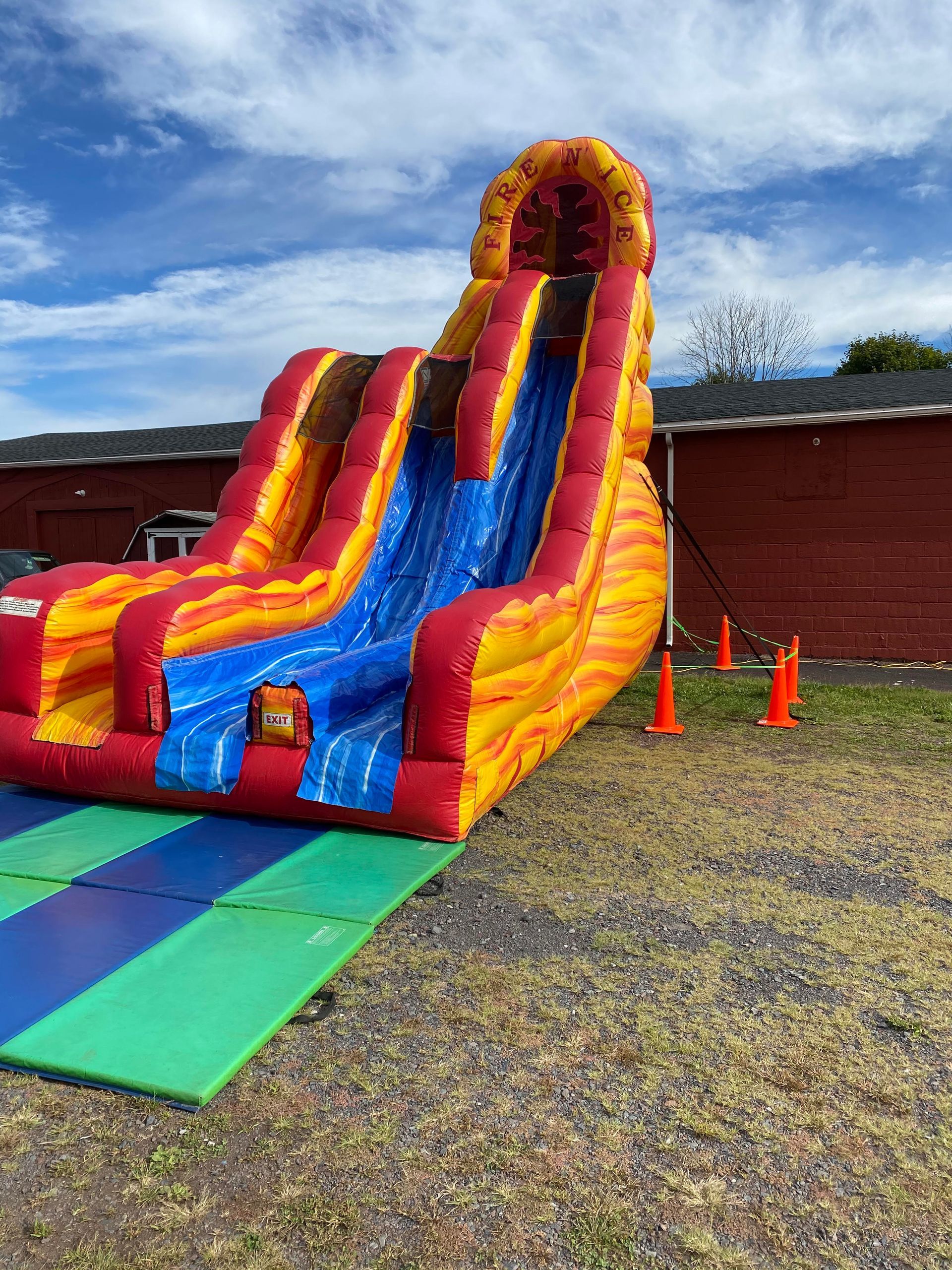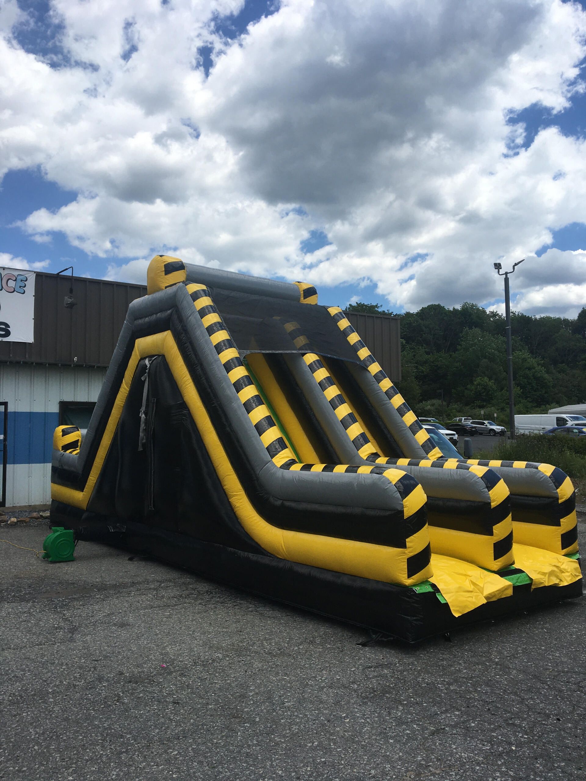 Our humongous Dual Lane Dry Slide is an excellent choice for fairs and festivals. This slide is a legit 2 1/2 stories high. If you are renting for private usage, please make sure there are no overhead wires or tree branches. Please make sure you add at least 5' to the dimensions listed below or we will not set up.