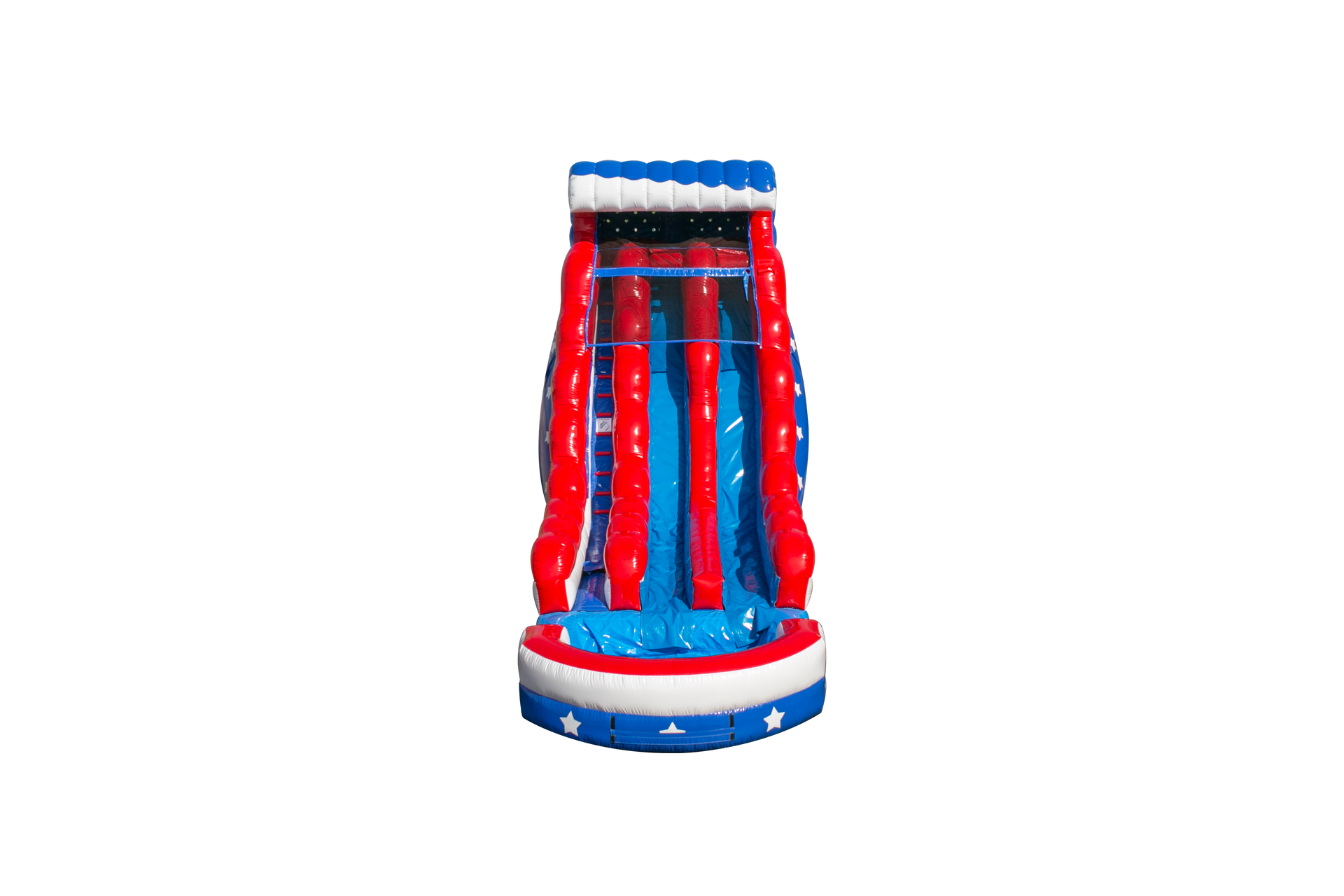 Our NEW Stars & Stripes Water Slide has dual lanes for added racing fun! Climb the 22' to reach for the stars! With its dual lanes, this slide allows for friendly competition and racing between participants, making it ideal for larger events.