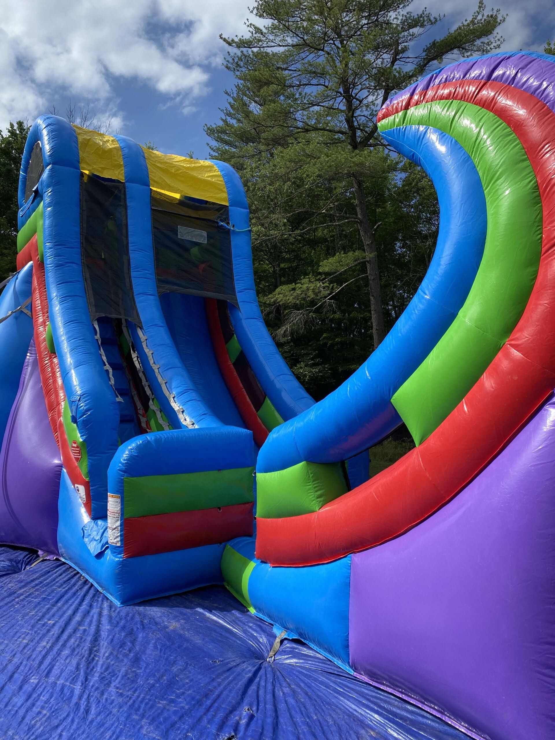 Our NEW Tidal Wave Water Slide has a curved landing for that extra excitement! Race each other down our 2-lane slide for some wet and wild fun!