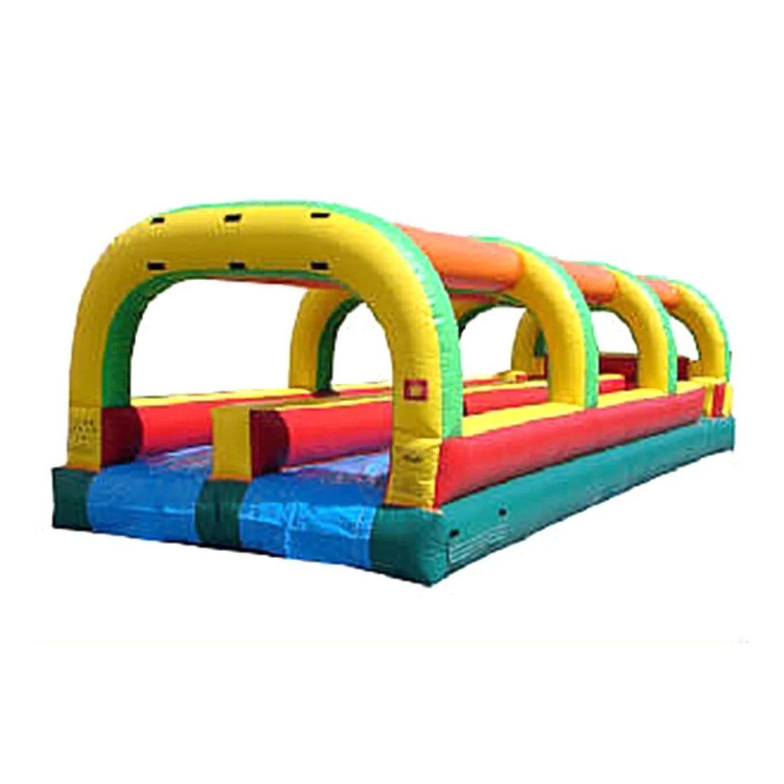 Our 2 Lane Slip n Slides are a wet, slippery blast. Yellow, orange, and green. Water sprays down from above onto the extra slick sliding lanes. This is an excellent unit for children through adults.