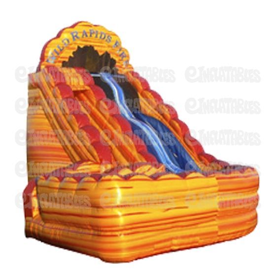 Our Wild Rapids Fire Water Slide with Landing is an exhilarating, two-lane water slide. Riders shoot down the individual sliding lanes where they encounter the thrill of a bump in the rapids before they scream around the curve and make a soft landing.